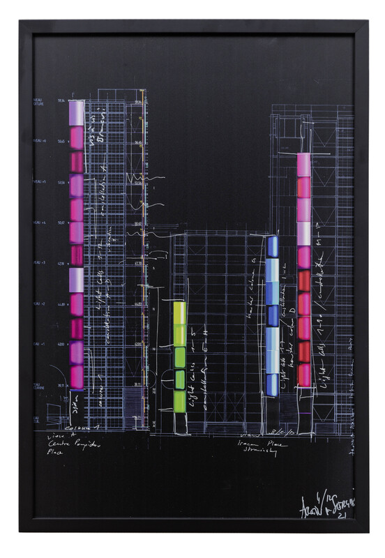 Infinite Light Column tribute to Brancusi, preparation drawing for the installation at Centre Pompidou