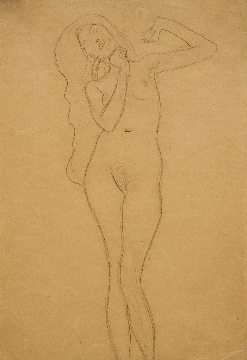 Stehender Frauenakt mit erhobenen Armen, Studie für "Jurisprudenz"