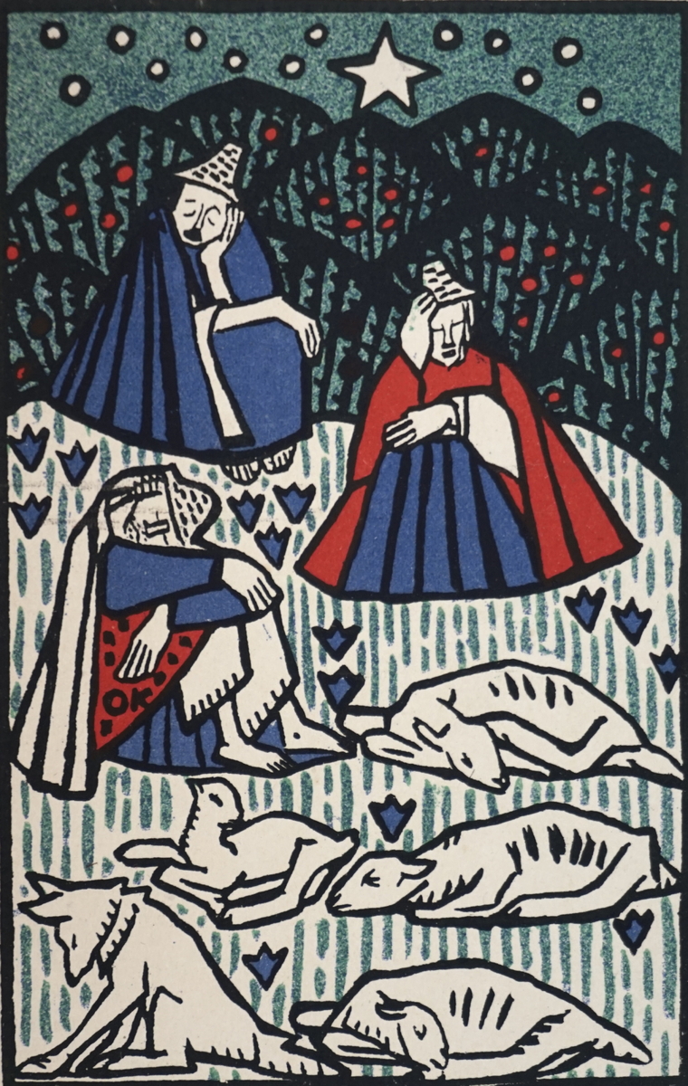 Three shepherds, dog and sheep, Wiener Werkstätte post card no. 116
